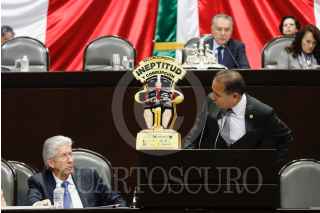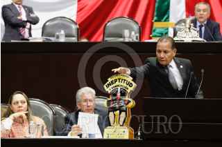 CIUDAD DE MÉXICO, 25OCTUBRE2018.- El diputado Alejandro Mojica le regalo un "reconocimiento" al secretario de Comunicaciones y Transportes, Gerardo Ruiz Esparza, durante su comparecencia por la Glosa del 6 Informe de Gobierno. En la sesión se le recordó el socavón en la del Paso Exprés, en donde murieron dos personas. FOTO: CUARTOSCURO.COM