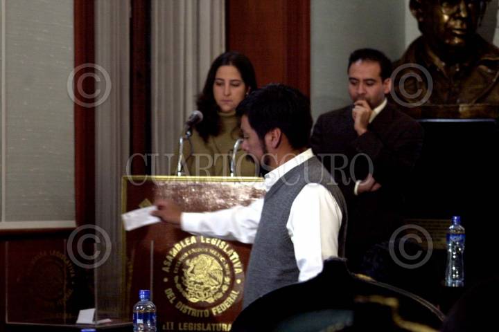 México, D.F. 02ENE2004.- Integrantes de la mesa directiva d la Asamblea Legislativa del DF, Silvia Oliva Fragoso (PRD), vicepresidenta, Jorge Lara (PAN), Roberto Carlos Reyes Gámiz (PRD), presidente y Javier Aguilar Álvarez (PRI), luego de tomar posesión de sus nuevos cargos. FOTO: Sandra Perdomo/CUARTOSCURO.COM