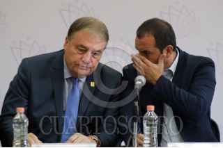 CUERNAVACA, MORELOS, 29OCTUBRE2018.- El gobernador del estado, Cuauhtémoc Blanco Bravo, platica con José Manuel Sanz, jefe de la oficina de la gobernatura, durante la instalación del Consejo para el Desarrollo Metropolitano de las zonas de Cuernavaca y Cuautla. FOTO: MARGARITO PÉREZ RETANA / CUARTOSCURO.COM
