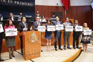 CIUDAD DE MÉXICO, 30OCTUBRE2018.- Los senadores de la bancada del PAN, encabezados por su coordinador Demián Zepeda, se manifestaron durante la sesión contra la cancelación de la construcción del Nuevo Aeropuerto Internacional de México (NAIM) por parte del Presidente de México, Andrés Manuel López Obrador, tras la consulta realizada el fin de semana, los panistas tacharon como falsa el ejercicio ciudadano convocado por el tabasqueño y mostraron pancartas tachándolo de autoritario. FOTO: CUARTOSCURO.COM
