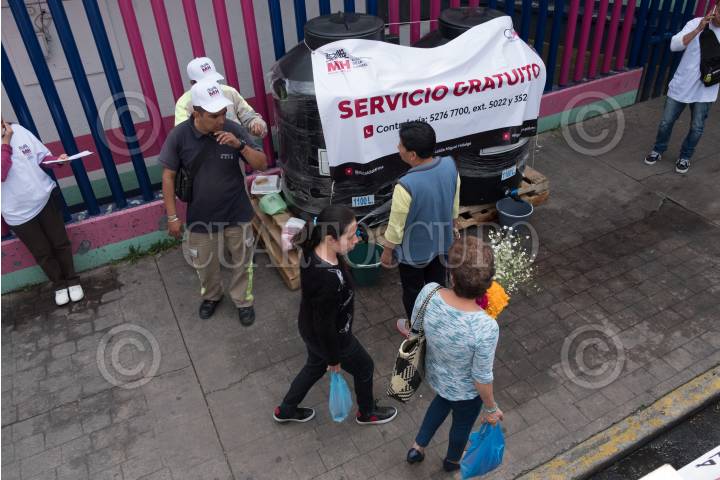 CIUDAD DE MÉXICO, 01NOVIEMBRE2018.- Debido al desabasto de agua que inició el día de ayer y continuará, según información del Gobierno de la ciudad, hasta el día miércoles, diversas delegaciones colocaron en puntos clave dentro de sus colonias tinacos de agua potable para que los moradores del área puedan abestecerse en caso de necesitarlo. Hasta la tarde del día de hoy los tambos lucen llenos y muy pocas personas han hecho uso de ellos, se espera, sin embargo, que en los días siguientes conforme los abastecimientos personales comiencen a reducirse, la gente acuda a ellos en mayor concurrencia. En la fotografía puede observarse un tambo ubicado en la delegación Azcapotzalco. FOTO: PEDRO ANZA /CUARTOSCURO.COM