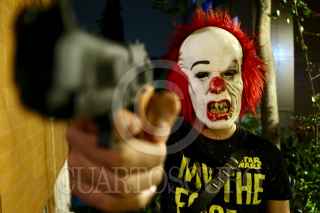 CIUDAD DE MÉXICO, 01NOVIEMBRE2018.- Un adolescente con máscara de payaso apunta su arma de juguete en su desfilar por calles de la ciudad de México buscando su calaverita esta noche de muertos. FOTO: MISAEL VALTIERRA / CUARTOSCURO.COM