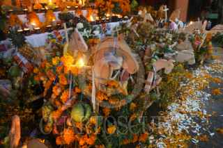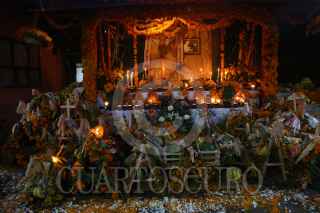 PÁTZCUARO, MICHOACÁN, 02NOVIEMBRE2018.- En Cuanajo, Michoacán en el primer aniversario de su difunto se tiene la tradición de colocar la ofrenda en las casas, lugar hasta donde llegan familiares y amigos a otorgarles los alimentos que les gustaban en vida al ser querido. Fruta, verduras, postres, bebidas, flores de cempasúchil y tiringini, son colocadas sobre la estructura de un caballo de madera que, según la creencia, el equino ayuda a los difuntos a cargar sus ofrendas en su retorno al más allá acabada la celebración. FOTO: JUAN JOSÉ ESTRADA SERAFÍN /CUARTOSCURO.COM