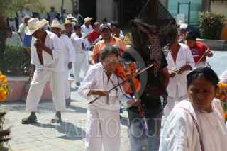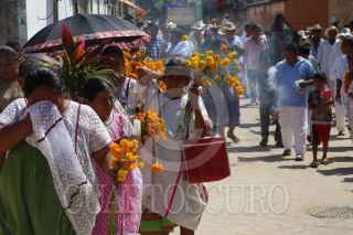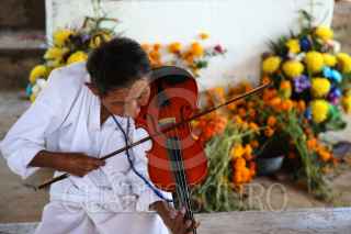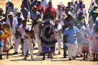 XOCHISTLAHUACA, GUERRERO, 02NOVIEMBRE2018.- Con música de viento, violín y una procesión al panteón indígenas Amuzgos despiden a sus muertos, mujeres vestidas con sus tradicionales huipiles y flores de cempaxúchitl encabezan la proceso que recorre el pueblo de Xochistlahuaca ubicado en la región de la Costa Chica de Guerrero, en el panteón realizan rezos, la música suena mientras platican y a si despiden a sus seres queridos que cada años visitan durante la celebración de día de muertos. FOTO: CARLOS ALBERTO CARBAJAL /CUARTOSCURO.COM