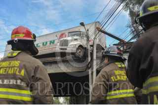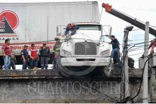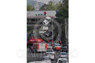 TLALNEPANTLA, ESTADO DE MÉXICO, 02NOVIEMBRE2018.- Bomberos y elementos de proteccion civil de Tlalnepantla, auxiliaron a un trailer que casi cae del puente vehícular de Tequesquinahuac, ubicado en las avenidas Reyes Heroles y Gustavo Baz FOTO: ARMANDO MONROY /CUARTOSCURO.COM