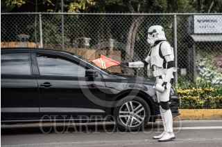 CIUDAD DE MÉXICO, 03NOVIEMBRE2018.- Una persona caracterizada de "soldado clon" de la película Star Wars, solicita unas monedas sobre circuito bicentenario, mientras auxilia al tráfico con indicaciones. FOTO: MARIO JASSO /CUARTOSCURO.COM