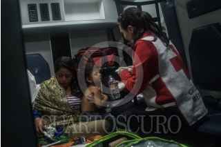 CIUDAD DE MÉXICO, 04NOVIEMBRE2018.- Auxiliados por policías de la Secretaría de Seguridad Pública de la Ciudad de México, Migrantes descienden de un vehículo a su llegada al albergue ubicado en Ciudad Deportiva. El primer contingente de migrantes en su mayoría provenientes de Honduras, arribaron a la capital del páis paso obligado en su ruta a la frontera norte con EE.UU. En su escala en la ciudad, son atendidos por la Comisión Nacional de Derechos Humanos, Cruz Roja y autoridades gubernamentales que les proveen alimentos durante su estancia. FOTOREPORTAJE: MISAEL VALTIERRA / CUARTOSCURO.COM