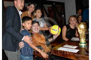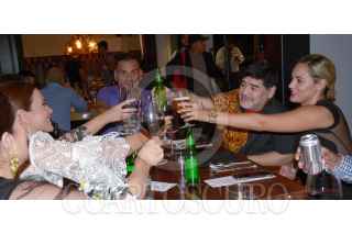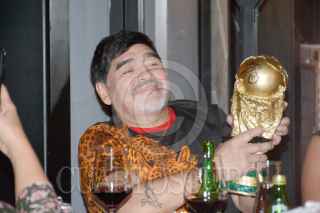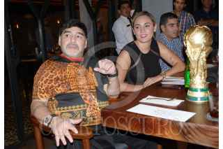 CULIACAN, SINALOA. 06NOVIEMBRE2018.- El astro de fútbol Diego Armando Maradona, entrenador del equipo Dorados de Sinaloa, participó en la "Cena con Causa" para recabar fondos para donarlos a los damnificados de las inundaciones que provocaron las últimas tormentas y huracanes que afectaron la zona centro y sur del estado. El costo de la cena fue de 3 mil 500 pesos por persona, a las cuales se les regaló un balón autografiado por Maradona. También se subastaron réplicas de la copa del mundo autografiadas por el campeón; así como una playera autografiada por Pique. Maradona llegó a la cena de la mano de su novia Rocío Oliva, quien nunca se separó del astro de fútbol. FOTO: JUAN CARLOS CRUZ / CUARTOSCURO.COM