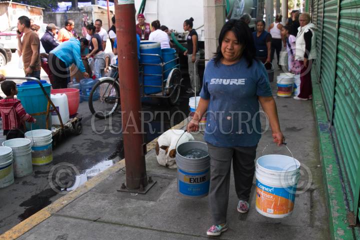 CIUDAD DE MÉXICO, 07NOVIEMBRE2018.- Tras prologarse más de una semana la suspensión de agua potable en la capital por los trabajos en el Sistema Cutzamala, el cual abastece del vital líquido a gran parte de la ciudad, los habitantes de la delegación Cuauhtémoc padecen las escasez por lo que se abastecen a través de la repartición de las pipas, recolectándola como pueden, botes, cubetas, garrafones, ollas, etc. En la imagen una pipa de la delegación Cuauhtémoc surte en la colonia San María la Ribera. FOTO: MOISÉS PABLO /CUARTOSCURO.COM