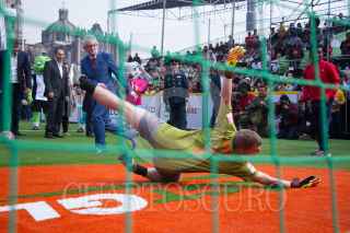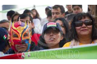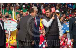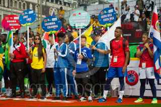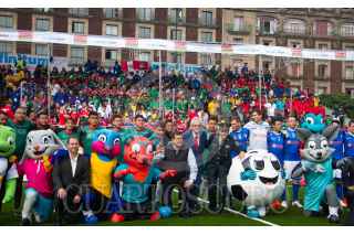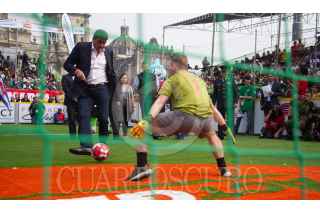 CIUDAD DE MÉXICO, 13NOVIEMBRE2018.- Mel Young, Fundador de la HWC, Arturo Elías Ayub, Director General de Fundación Telmex-Telcel y José Ramón Amieva, Jefe de Gobierno de la CDMX, Horacio de la Vega, encabezaron la ceremonia de inicio de Homeless World Cup Mexico 2018, en el Zócalo de la Capital Mexicana. FOTO: VICTORIA VALTIERRA / CUARTOSCURO.COM