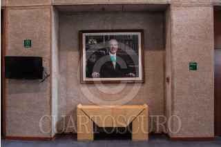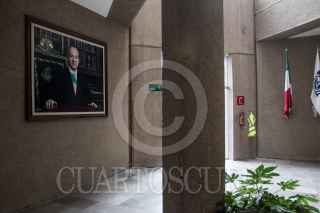 CIUDAD DE MÉXICO, 14NOVIEMBRE2018.- El retrato del ex presidente de México (2006-2012) y ex miembro del Partido Acción Nacional (PAN), Felipe Calderón Hinojosa, cuelga en una de las paredes principales del recinto de la sede nacional de este instituto político. En días pasados Calderón Hinojosa renunció al PAN tras 30 años de militancia. FOTO: MISAEL VALTIERRA /CUARTOSCURO.COM