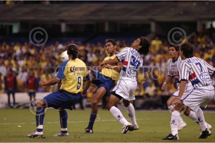 MEXDF14MARZO2004.- El americanista Reinaldo Navia fue amolestado por esta barrida contra el azulgrana Mario Hernandez. El America se enfrento al Atlante en el estadio Azteca. FOTO: Germán Romero/CUARTOSCURO.COM