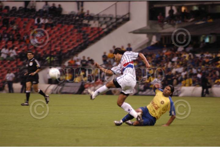 MEXDF14MARZO2004.- El americanista Reinaldo Navia fue amolestado por esta barrida contra el azulgrana Mario Hernandez. El America se enfrento al Atlante en el estadio Azteca. FOTO: Germán Romero/CUARTOSCURO.COM