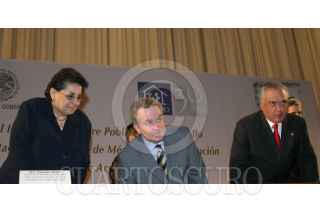 México, D.F. 04 Mayo 2004.- Thoraya Obaid, directora del Fondo de Población de las Naciones Unidas, Santiago Creel Miranda, secretario de Gobernación, y el senador Adrían Alanís Quiñonez, presidente de la Comisión de población y desarrollo de la Cámara de diputados al inicio del Foro sobre la Población y desarrolo a diez años de la CIPD. FOTO: Sandra Perdomo/CUARTOSCURO.COM
