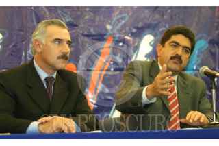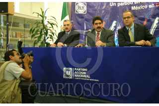 México, D.F. 04 Mayo 2004.- Alejandro Zapata Perogordp, ex diputado y Manuel Espino secretario general del PAN, Juan Ignacio Zavala, vocero, en conferencia de prensa donde afirmaron que el partido no siente responsabilidad por el caso Ahumada, por que solamente lo exhibieron. FOTO: Sandra Perdomo/CUARTOSCURO.COM