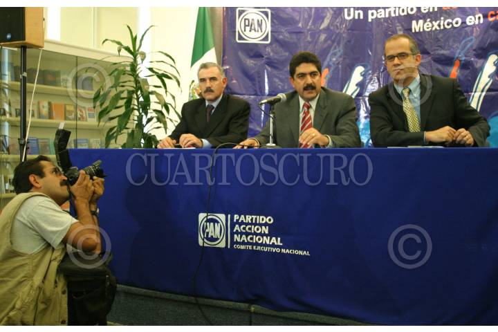 México, D.F. 04 Mayo 2004.- Alejandro Zapata Perogordp, ex diputado y Manuel Espino secretario general del PAN, Juan Ignacio Zavala, vocero, en conferencia de prensa donde afirmaron que el partido no siente responsabilidad por el caso Ahumada, por que solamente lo exhibieron. FOTO: Sandra Perdomo/CUARTOSCURO.COM