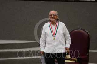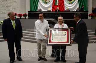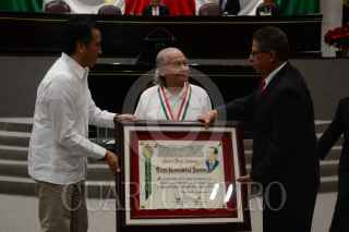 XALAPA, VERACRUZ, 03DICIEMBRE2018.- Juan Hernández Ramírez recibió la medalla “Adolfo Ruiz Cortines 2018” que le fue entregada en el Congreso local, con la asistencia del gobernador Cuitláhuac García. El galardonado aseguro que se requiere de instancias y personas con voluntad para lograr el cambio con una visión inclusiva de los pueblos indígena. FOTO: ALBERTO ROA /CUARTOSCURO.COM