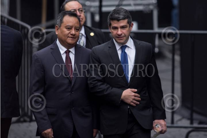 CIUDAD DE MÉXICO, 05DICIEMBRE2018.- Miguel Torruco, secretario de Turismo, conversa con José Ramón López Beltrán, hijo del presidente Andrés Manuel López Obrador, en las escalinatas del Congreso Local de la Ciudad de México, en donde Claudia Sheinbaum tomó protesta como Jefa de Gobierno ante el pleno legislativo. FOTO: GALO CAÑAS /CUARTOSCURO.COM