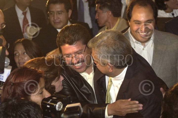 México D.F 05 Mayo 2004.- Andrés Manuel López Obrador jefe de gobierno del D.F se despide de Ricardo Monreal gobernador de Zacatecas al término de la ceremonia conmemorativa del 15 aniversario del partido de la Revolución Democrática. FOTO: Eunice Adorno/CUARTOSCURO.COM