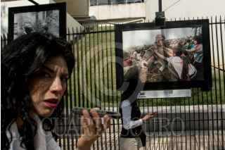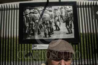 CIUDAD DE MÉXICO, 06DICIEMBRE2018.- "Huelga de mineros desnudos", fotografía del fotoperiodista y director de Cuartoscuro, Pedro Valtierra, que se exhibe en las rejas del Senado de la República como parte de la exposición por el 35 aniversario del períodico La Jornada. FOTO: MISAEL VALTIERRA /CUARTOSCURO.COM