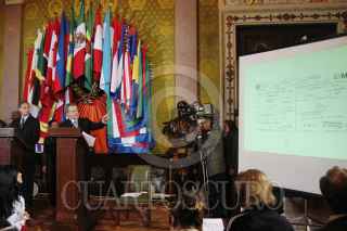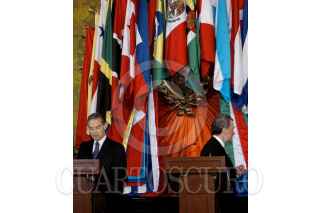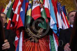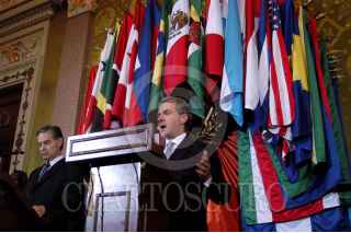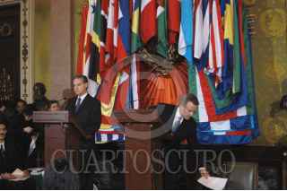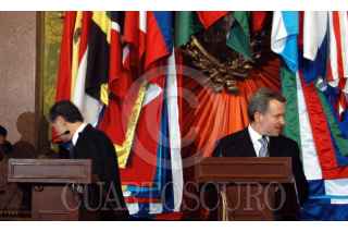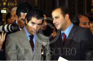 MEXDF06MAYO2004.- Durante una conferencia de prensa en el salon Panamericano de palacio nacional, los directores de comunicación social, Fernando Tovar y de Teresa de Gobernación y Alan Nahum Kaim de Relaciones Exteriores comentan los discursos de sus jefes. FOTO: Germán Romero/CUARTOSCURO.COM