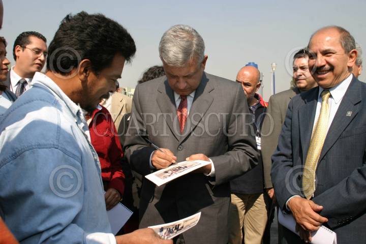 México, D. F. 07 Mayo 2004.- El jefe de gobierno del Distrito Federal, Andrés Manuel López Obrador, firma unas fotos que un trabajar de la planta de Bombeo de Aguas Combinadasle pidió que le autografiara. FOTO: Nelly Salas/CUARTOSCURO.COM