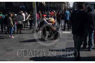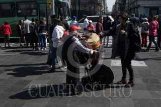 CIUDAD DE MÉXICO, 16DICIEMBRE2018.- Un músico con timbales aprovecha el paso de transeuntes en el cruce de avenida Juárez y Eje Central para ganarse unas monedas. FOTO: MOISÉS PABLO /CUARTOSCURO.COM