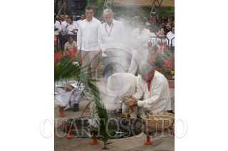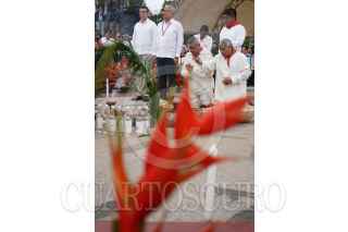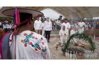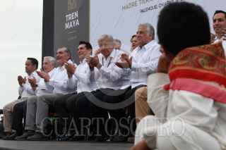 PALENQUE, CHIAPAS, 16DICIEMBRE2018.- En una ceremonia, las 12 comunidades indígenas Mayas de Chiapas ofrendaron comida a la madre tierra para pedirle permiso en la construcción del tren Maya, que recorrerá los estados de Tabasco, Chiapas, Quintana Roo, Campeche y Yucatán. La ceremonia fue encabezada por el presidente Andrés Manuel López Obrador, y se realizó en la antigua pista aérea de Palenque, en donde se construirá la estación Palenque, un nuevo palacio municipal y una plaza cívica. FOTO: PRESIDENCIA DE LA REPÚBLICA /CUARTOSCURO.COM