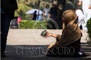 CIUDAD DE MÉXICO, 16DICIEMBRE2018.- A la sombra de un árbol, una mujer pide monedas a los visitantes del Bosque de Chapultepec. FOTO: GALO CAÑAS /CUARTOSCURO.COM