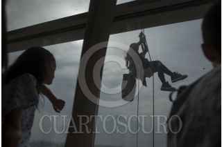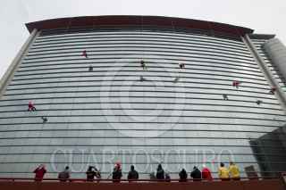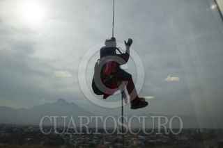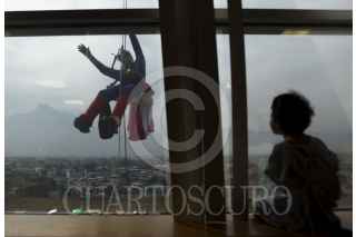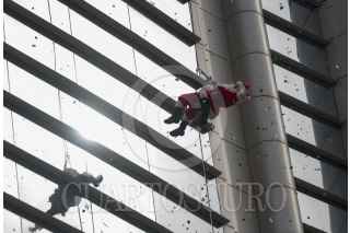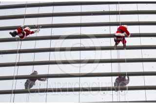 MONTERREY, NUEVO LEÓN, 18DICIEMBRE2018.- Hombres vestidos de Santa Claus y de súper héroes realizan rapel en el edificio del Hospital Materno Infantil. FOTO: GABRIELA PÉREZ MONTIEL /CUARTOSCURO.COM