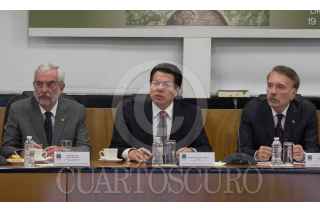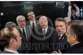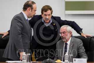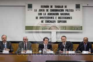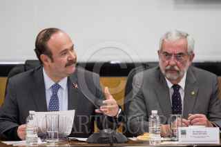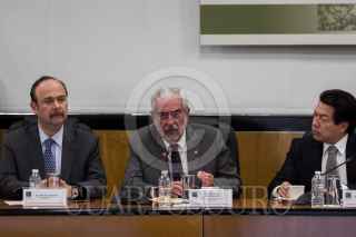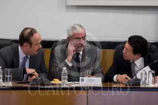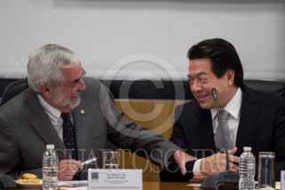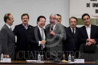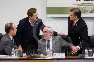 CIUDAD DE MÉXICO, 19DICIEMBRE2018.- Jaime Valls Esponda, secretario general ejecutivo de la Asociación Nacional de Universidades e Instituciones de Educación Superior (ANUIES); Enrique Graue Wiechers, rector de la Universidad Nacional Autónoma de México (UNAM); Mario Delgado, coordinador morenista; Mario Rodríguez Casas, director general del IPN, y René Juárez Cisneros, coordinador priista, durante su participación, en la Cámara de Diputados, en la reunión con la Junta de Coordinación Política (JUCOPO) y ANUIES respecto al tema de recorte al presupuesto para universidades, propuesto en el paquete económico 2019. No obstante, el presidente Andrés Manuel López Obrador declaró, el día de ayer, que ya no se recortaría el gasto de las instituciones educativas. FOTO: GALO CAÑAS /CUARTOSCURO.COM