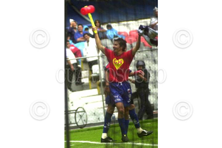 PACHUCA, HGO 09 MAYO 2004.- Osvaldo Lucas de los Freseros del Irapuato (izquierda) detiene un avance de los locales ante la mirada de Claudinho, durante el partido 18 del Campeonato Clausura 2004 del futbol mexicano, disputado en el Estadio Hidalgo. FOTO: David Martínez/CUARTOSCURO.COM
