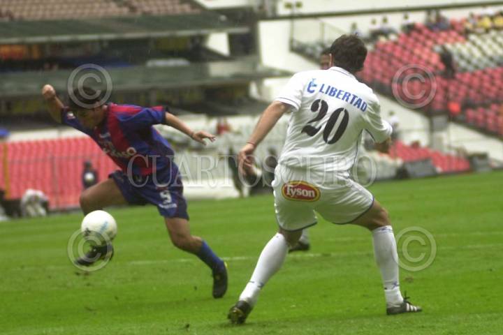 PACHUCA, HGO 09 MAYO 2004.- Osvaldo Lucas de los Freseros del Irapuato (izquierda) detiene un avance de los locales ante la mirada de Claudinho, durante el partido 18 del Campeonato Clausura 2004 del futbol mexicano, disputado en el Estadio Hidalgo. FOTO: David Martínez/CUARTOSCURO.COM