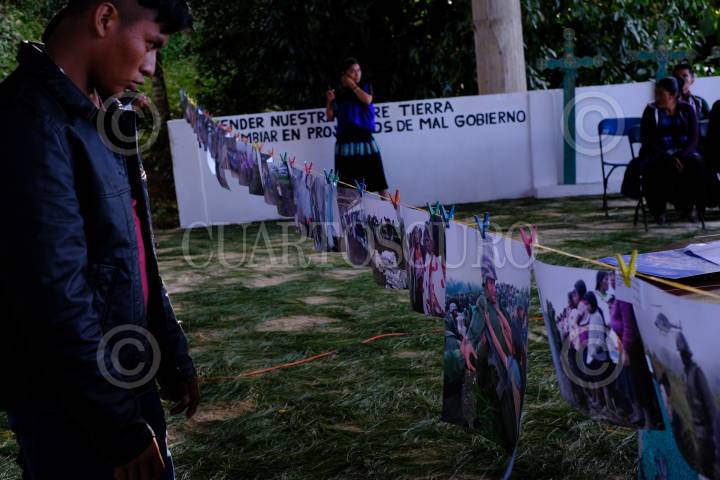 CHENALHO, CHIAPAS, 21DICIEMBRE2018.- Pedro Valtierra expuso 30 fotografías en un evento previo a la conmemoración del aniversario de "La Matanza de Acteal". Las fotografías se montaron en un hilo del cual se colgaron con broches para ropa. El evento fue organizado por la la organización civil "Las Abejas de Acteal" y estuvo armonizado con el coro de Acteal, se tocó música regional, y se expusieron fotografías del fotógrafo Pedro Valtierra, director de la agencia Cuartoscuro, el fotógrafo Nestor Jimenez Díaz y se hizo una proyección del documental "Lupita: la Semilla". FOTO: PEDRO VALTIERRA /CUARTOSCURO.COM