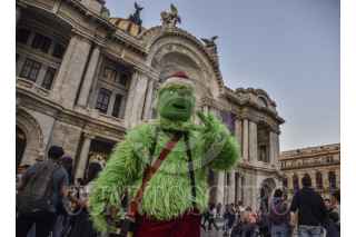 CIUDAD DE MÉXICO, 22DICIEMBRE2018.- Una persona disfraza del personaje ficticio “El Grinch” posa para ser fotografiado por los transeúntes en la explanada de Bellas Artes para poder recaudar algunas monedas. FOTO: MARIO JASSO /CUARTOSCURO.COM
