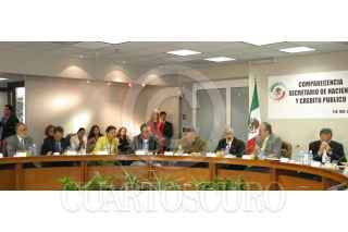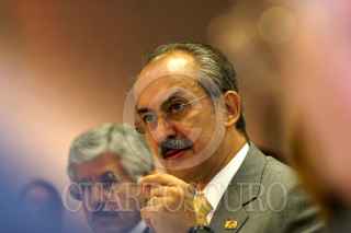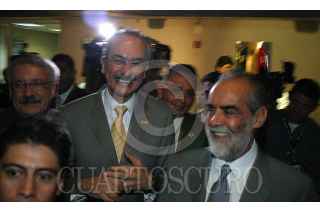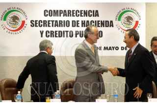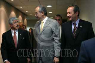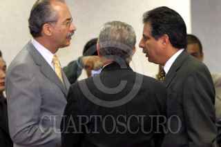 México, D.F. 18 MAYO 2004.- El senador panista Fauzi Handam (izq) y Javier Jiménez, senador priísta y presidente de la comisión de HCP (der), al recibir a Francisci Gil Díaz, secretario de Hacienda y Credito Público, para llevar a cabo su comparecencia ante legisladores. FOTO: Sandra Perdomo/CUARTOSCURO.COM