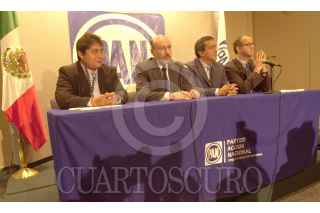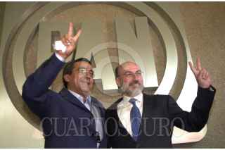 MEXDF18MAYO2004.- Edgar Ramírez Pech dirigente estatal del PAN en Yucatán festeja con Luis Felipe Bravo Mena, presidente de Acción Nacional, el triunfo panista en el sureste en las recientes elecciones. FOTO: Eunice Adorno/CUARTOSCURO.COM