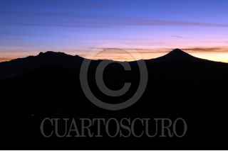 CIUDAD DE MÉXICO, 29DICIEMBRE2018.- Las siluetas a contraluz de los volcanes Iztaccíhuatl y Popocatépetl en el amanecer de este día desde la cima del volcán El Pelado, de 3620 msnm, ubicado al sur en el Campo Volcánico Sierra Chichinautzin, cerca de la comunidad de Parres en Tlalpan. FOTO: MARGARITO PÉREZ RETANA /CUARTOSCURO.COM