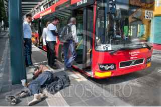 CIUDAD DE MÉXICO, 31DICIEMBRE2018.- Una persona en situación de calle duerme sobre una estación del metrobus mientras los pasajeros abordan de manera normal dicho transporte público. FOTO: DIEGO SIMÓN SÁNCHEZ /CUARTOSCURO.COM