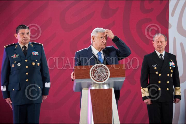 CIUDAD DE MÉXICO, 02ENERO2019.- Andrés Manuel López Obrador, presidente de México; Luis Cresencio Sandoval, secretario de la Defensa Nacional; Rafael Ojeda, secretario de Marina, y Alfonso Durazo, secretario de Seguridad, ofrecieron la conferencia matutina en Palacio Nacional, en la que presentaron el programa de reclutamiento de jóvenes para integrar la Guardia Nacional en la que se busca la incorporación de 50 mil jóvenes. FOTO: DIEGO SIMÓN SÁNCHEZ /CUARTOSCURO.COM