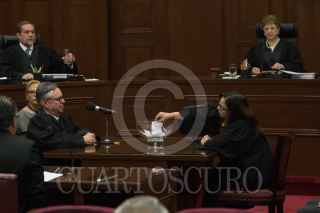 CIUDAD DE MÉXICO, 02ENERO2019.- Los ministros Eduardo Medina Mora y Norma Lucía Piña Hernández cuentan los votos de la elección que llevaron a cabo todos integrantes de la Suprema Corte de Justicia de la Nación para a elegir al nuevo ministro presidente, que a la postre fue elegido el ministro Arturo Zaldívar Lelo de Larrea. FOTO: MOISÉS PABLO /CUARTOSCURO.COM