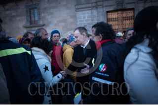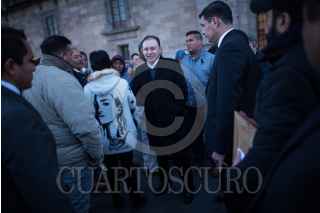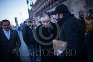 CIUDAD DE MÉXICO., 04ENERO2019.- El Secretario de Seguridad Pública, Alfonso Durazo, es abordado, a las afueras de Palacio Nacional, por integrantes del Sindicato Mexicano de Electricistas al termino de la conferencia matutina en la cual acompañó al presidente de la República, Andrés Manuel López Obrador. FOTO: PEDRO ANZA /CUARTOSCURO.COM