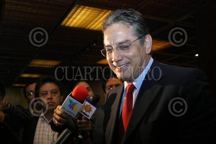 México, D.F. 29 JUNIO 29 2004.- Emilio Chuayffett, coordinador de la bancada del priísta siendo entrevistado por la fuente al terminar la reunión privada que sostuvo el grupo parlamentario. FOTO: Sandra Perdomo/CUARTOSCURO.COM