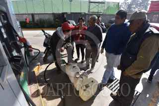 METEPEC, ESTADO DE MÉXICO, 10ENERO2019.- Largas filas de automóviles y personas se pueden observar en diversas gasolineras de este municipio que también ha sido afectado por el desabasto de gasolina, la gente acude con varios garrafones para no tener que volver a formarse en algunos días mientras se regulariza el abasto. FOTO: ARTEMIO GUERRA BAZ /CUARTOSCURO.COM