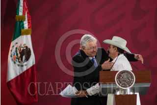 CIUDAD DE MÉXICO, 11ENERO2019.- Andrés Manuel López Obrador, presidente de México; abraza efusivamente a Jorge Zapata, nieto del héroe revolucionario, Emiliano Zapata, durante la conferencia matutina a medios de comunicación. FOTO: MISAEL VALTIERRA / CUARTOSCURO.COM