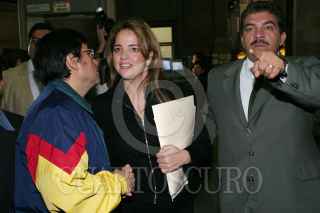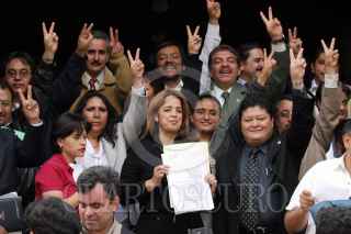 México, D.F., 02JULIO2004.- Lorena Villavicencio, coordinadora de los asambleístas perredistas en la ALDF, Carlos Reyes Games y Alfredo Hernández Raigosa, muestran la copia de la controversia constitucional encontra del desafuero del jefe de gobierno, que presentaron en la Suprema Corte de Justicia de la Nación. FOTO: Moisés Pablo/CUARTOSCURO.COM