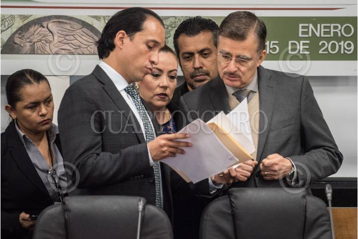 CIUDAD DE MÉXICO, 15ENERO2019.- Se realizó la Tercera Reunión de Trabajo de la Tercera Comisión Permanente, a pesar de la ausencia de Rocio Nahle, secretaría de Energía; Octavio Romero, director general de Petróleos Mexicanos; Carlos Urzúa, secretario de Hacienda y Crédito Público y Ricardo Sheffield; titular de la Procuraduría Federal del Consumidor. En la reunión con los titulares se tenía contemplado dialogar sobre la estrategia que implementó el Ejecutivo federal para eliminar el robo de combustibles. En la imagen el diputado Mario Delgado Carrillo, coordinador de los Diputados de Morena, y Ricardo García Escalante, presidente de la Tercera Comisión Permanente. FOTO: MARIO JASSO /CUARTOSCURO.COM