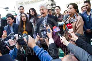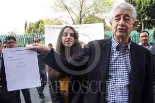 CIUDAD DE MÉXICO, 15ENERO2019.- César Augusto Santiago, presento su renuncia a su militancia de 50 años en el PRI, en la sede nacional del partido. Lo acompaño su nieta y jóvenes militantes de su partido. FOTO: VICTORIA VALTIERRA /CUARTOSCURO.COM