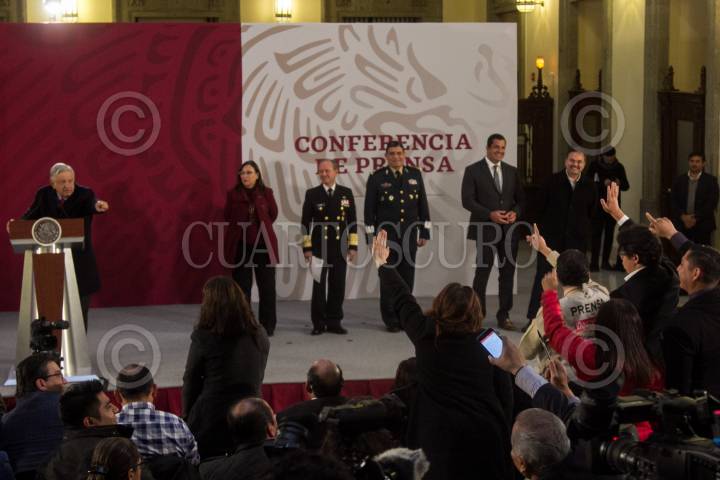 CIUDAD DE MÉXICO, 16ENERO2019.- Rafael Ojeda, secretario de Marina; Andrés Manuel López Obrador, presidente de México; Luis Cresencio Sandoval, secretario de la Defensa Nacional; Rocío Nahle, secretaria de Energía, y Ricardo Peralta Saucedo, titular de Administración General de Aduanas y de Comercio Exterior, durante su conferencia de prensa mañanera para dar de los avances y estrategias en operación para evitar el robo de hidrocarburos. FOTO: GALO CAÑAS /CUARTOSCURO.COM