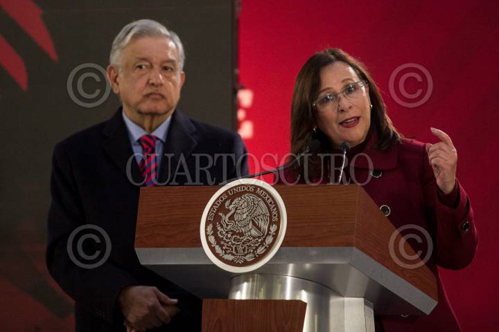 CIUDAD DE MÉXICO, 16ENERO2019.- Rafael Ojeda, secretario de Marina; Andrés Manuel López Obrador, presidente de México; Luis Cresencio Sandoval, secretario de la Defensa Nacional; Rocío Nahle, secretaria de Energía, y Ricardo Peralta Saucedo, titular de Administración General de Aduanas y de Comercio Exterior, durante su conferencia de prensa mañanera para dar de los avances y estrategias en operación para evitar el robo de hidrocarburos. FOTO: GALO CAÑAS /CUARTOSCURO.COM